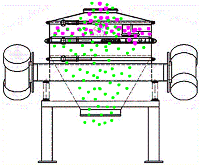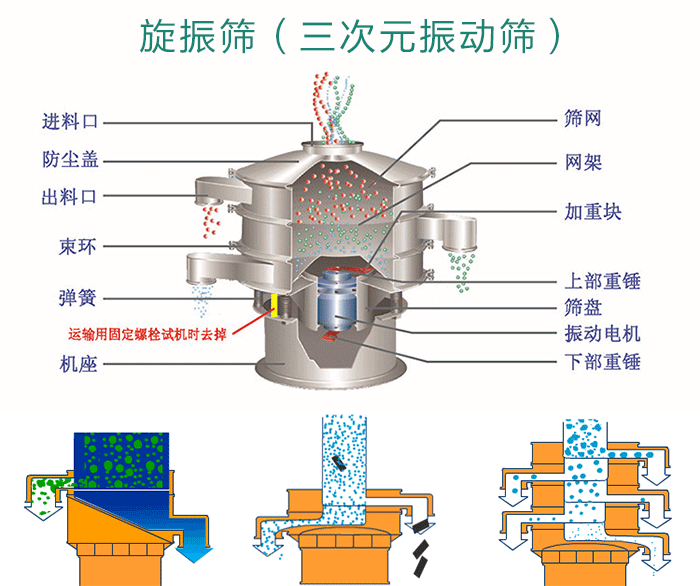 旋振篩是由電機提供振動源,從進(jìn)料口投入物料,在振動狀態(tài)下穿過篩網(wǎng)直到出料口;防塵蓋、束環(huán)是為振動篩提供封閉狀態(tài)的。