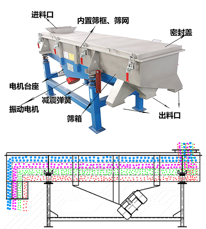 直線篩于直線振動篩是一樣的產(chǎn)品其結(jié)構(gòu)可簡單分為:進(jìn)料口、篩機蓋、篩板、出料口、彈簧和電機。