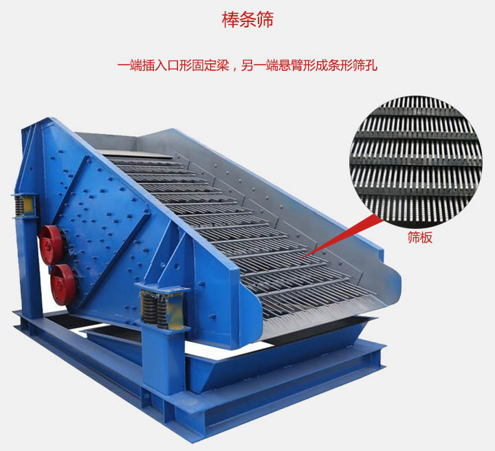 棒條篩篩面是由一組相互平行的彈簧棒條和安裝棒條的固定梁等組成的,鋼棒采用65Mn,55CrSi,60SiMn等彈簧鋼,一段插入口形固定梁,另一端懸臂形成條形篩孔,棒條的長度設(shè)計在220-360mm之間。該設(shè)備主要適用于破碎機前大塊物料的均勻給料,以及垃圾的篩分處理等行業(yè)中。