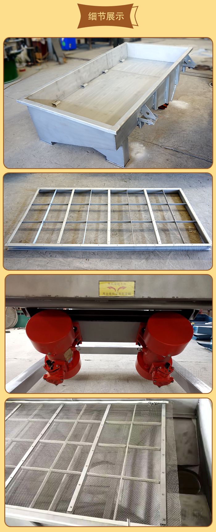 5、電機臺座:安裝振動電機,使用前連接螺釘必須擰緊,特別是新篩機試用前三天、必須反復(fù)緊固,以免松動造成事故。